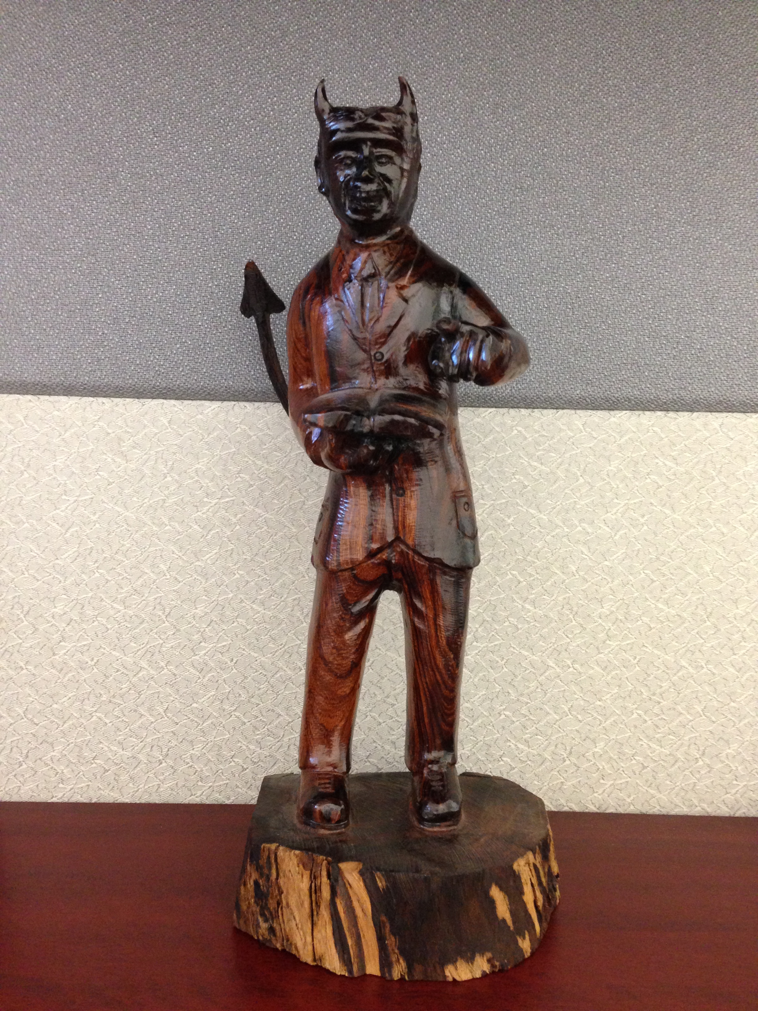Por último a veces pareciera que estos líderes públicos y privados carecen de toda verdad y podíamos mejor creerle mejor a esta figura que se muestra al inicio del escrito, hecha de palo fierro, traída desde Sonora, con cuernos y cola, como más verosímil versus las promesas de esos personajes a los que nos hemos referido.
