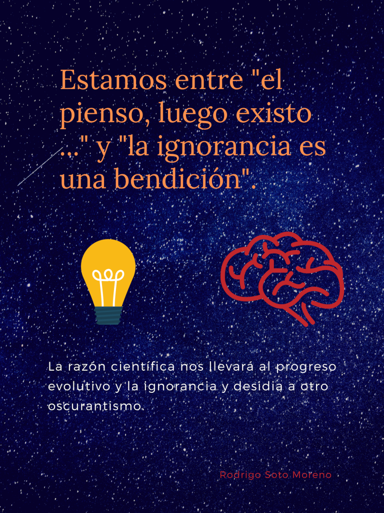 Estamos entre el “pienso, luego existo…” y “la ignorancia es una bendición” March 28, 2019March 28, 2019 rrsm Spread the love La razón científica nos llevará al progreso evolutivo y la ignorancia y desidia a otro oscurantismo.