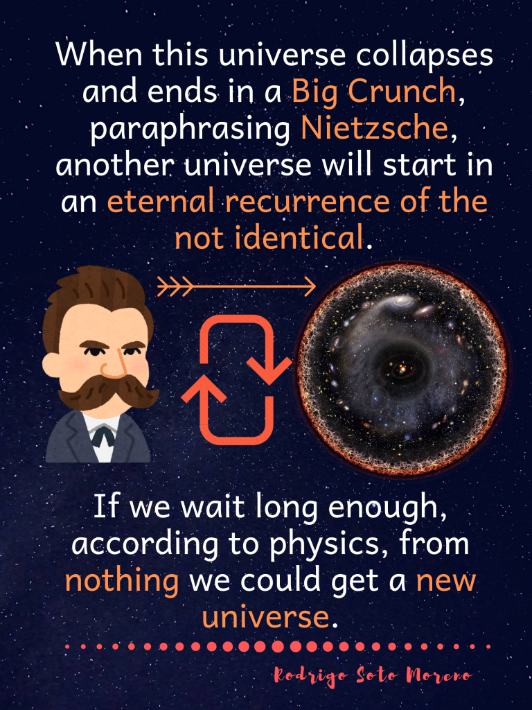 Eternal recurrence of the not identical September 11, 2019September 11, 2019 rrsm Spread the love If we wait long enough, according to physics, from nothing we could get a new universe.